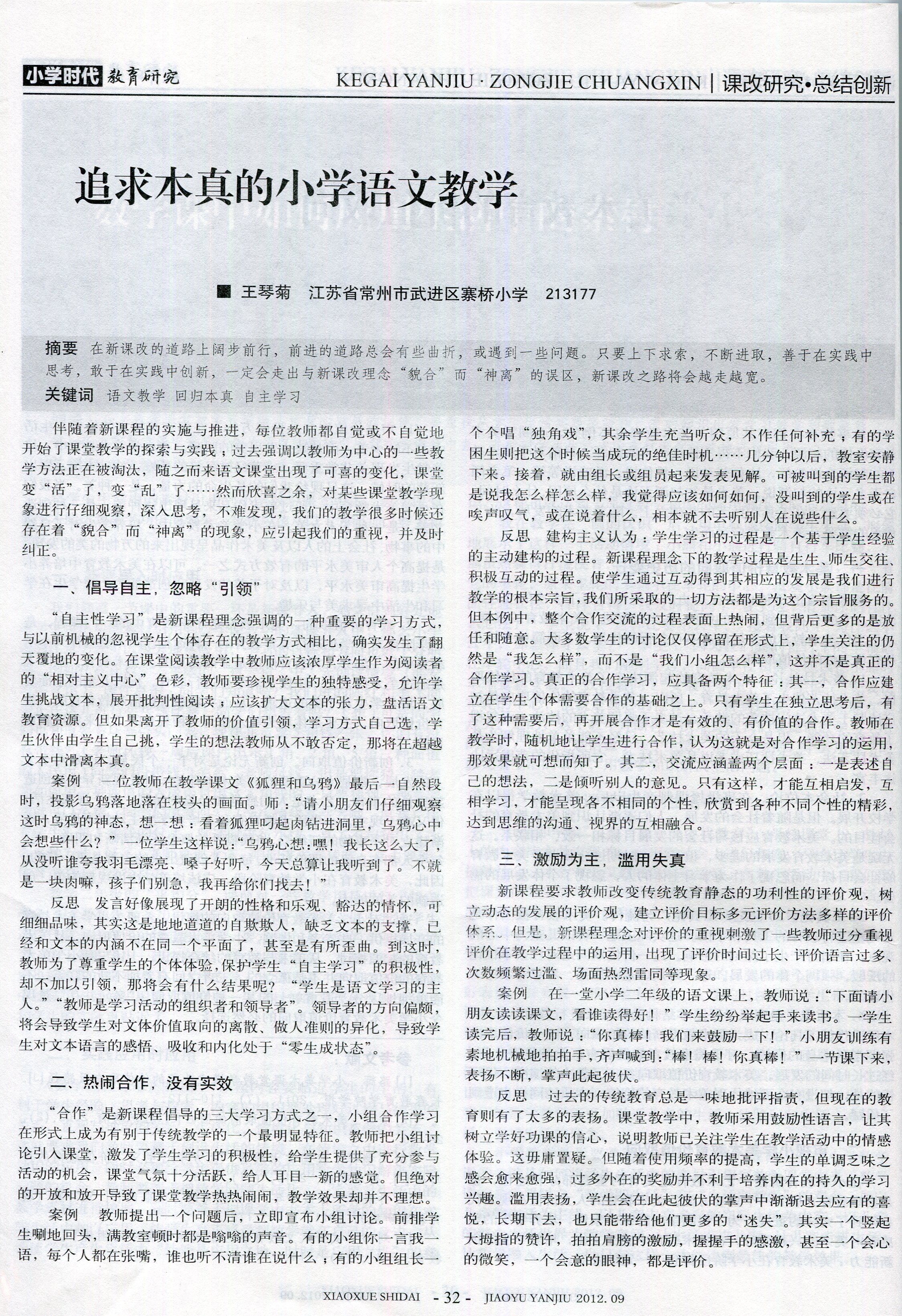 发表论文:《追求本真的小学语文教学》(王琴菊)