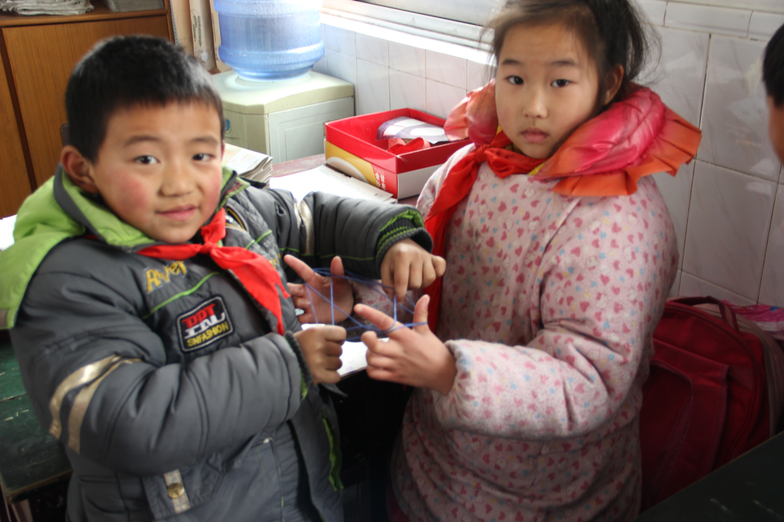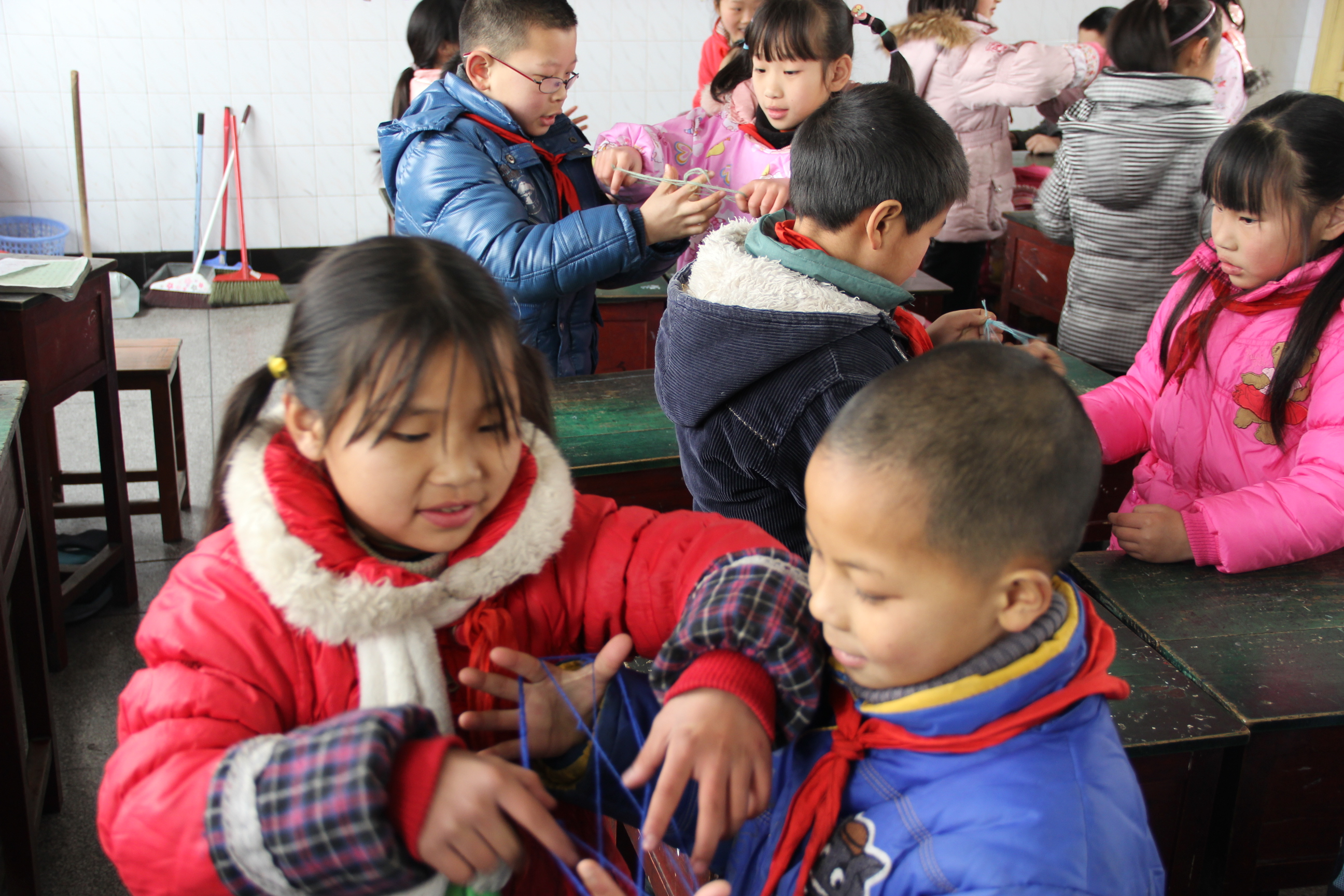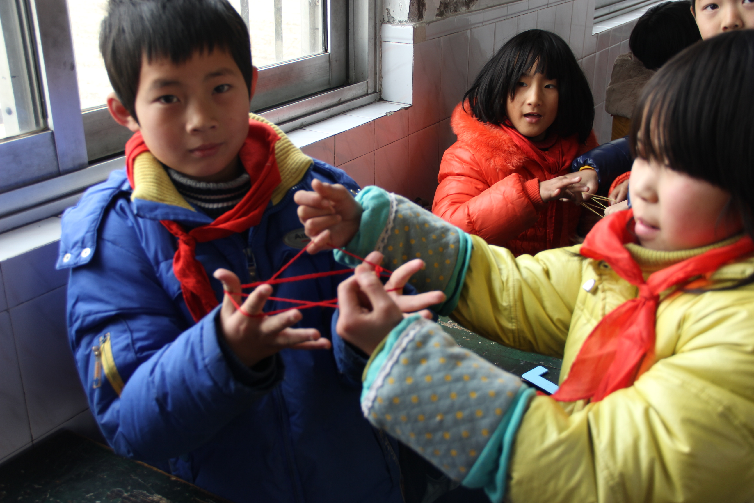 一人手上套着线,让另外一人来挑,一定要挑出形状来,不能让线散掉。