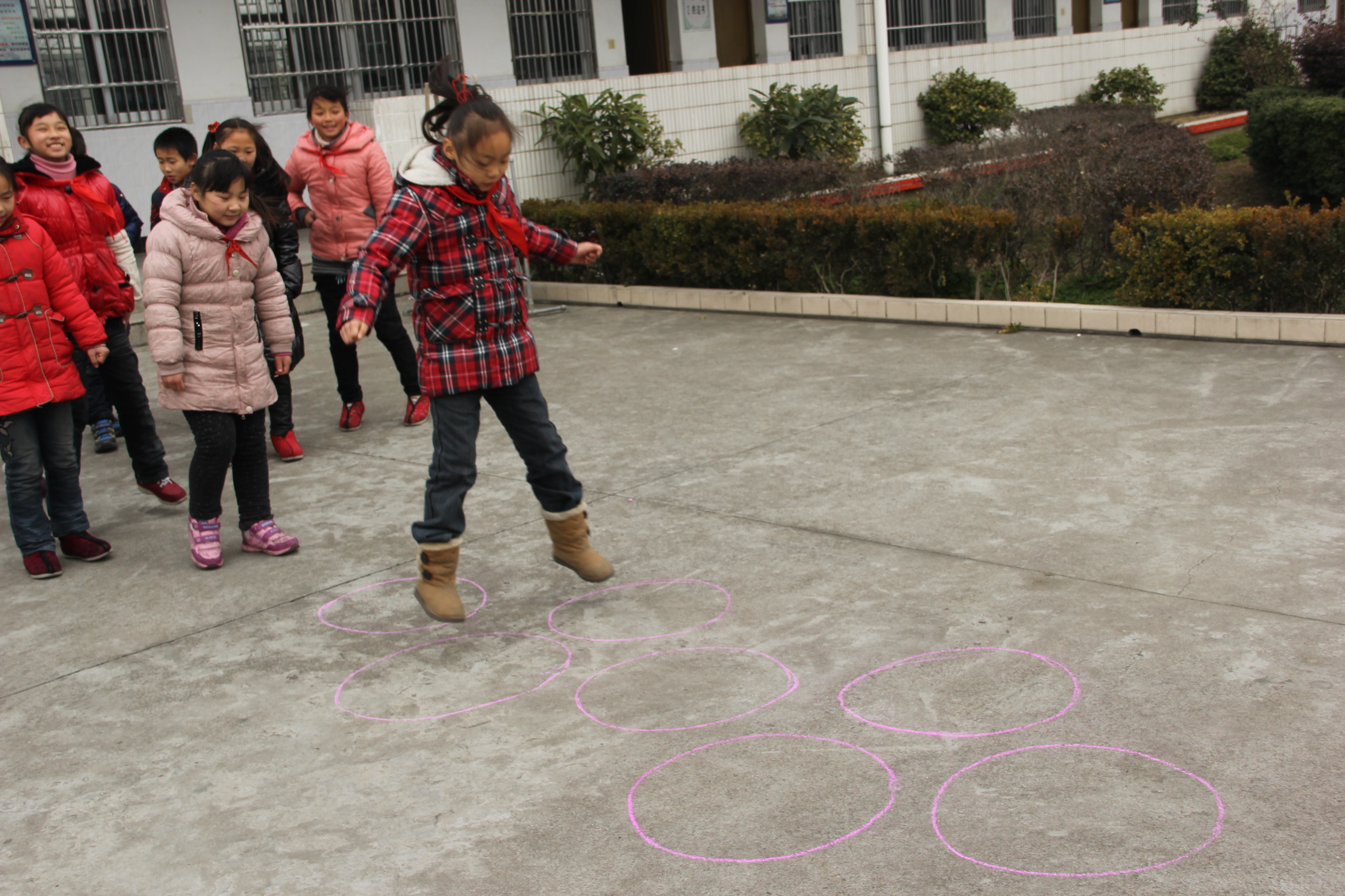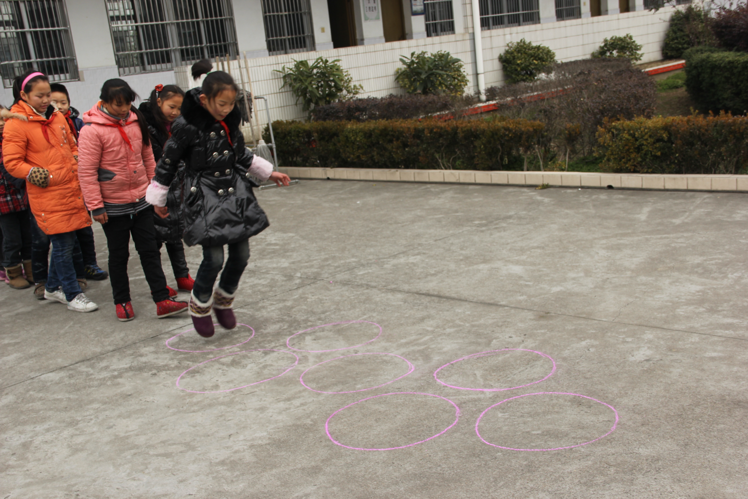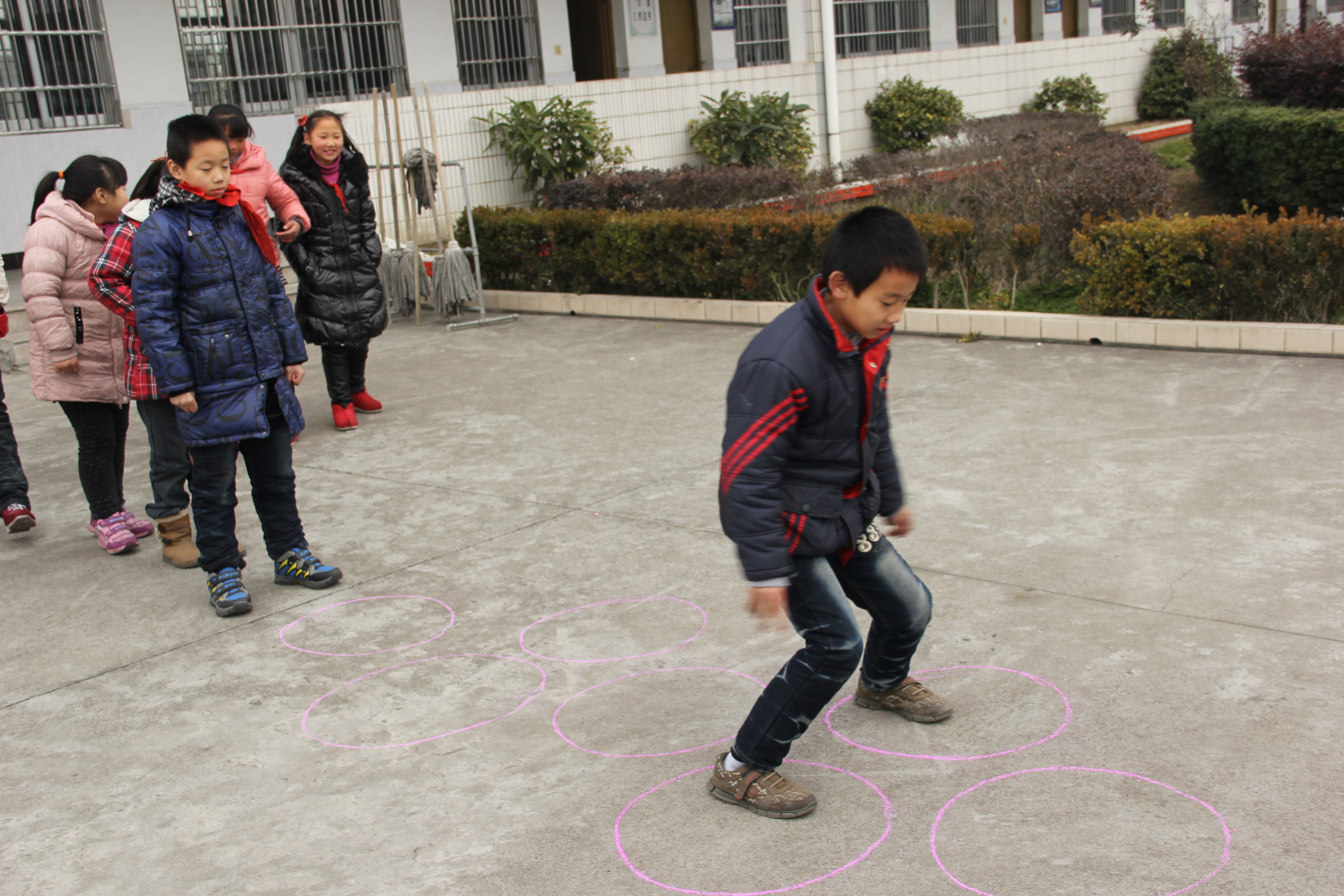 游戏方法:在空地上画上一个两个一个两个……圈圈,学生有次序的进行跳圈活动,从圈头跳到圈尾,跑回原地拍一下下一位小朋友的手,接着游戏,直到一排小朋友全部轮一次,游戏结束。游戏可根据学生活动情况进行数次。
