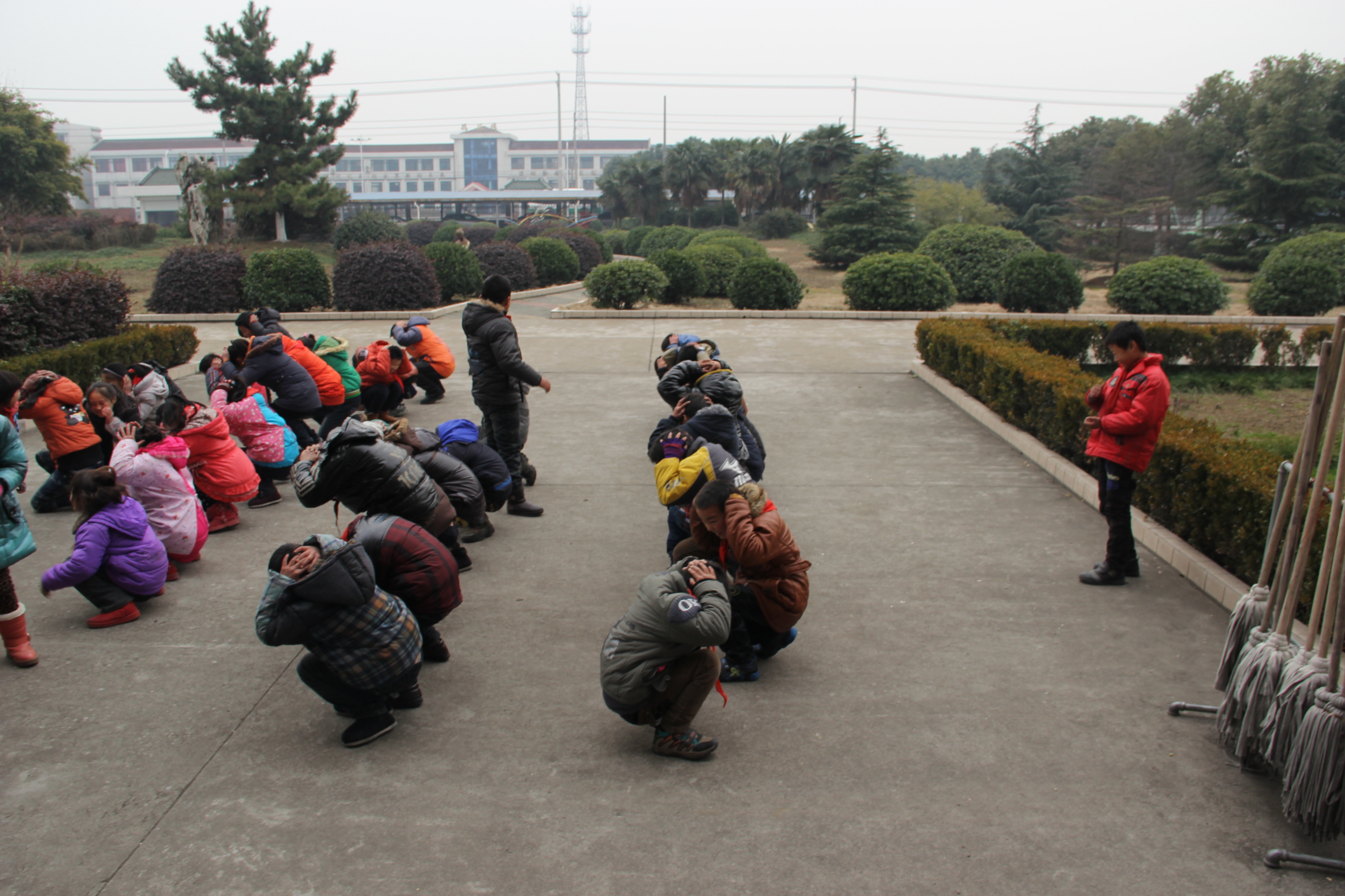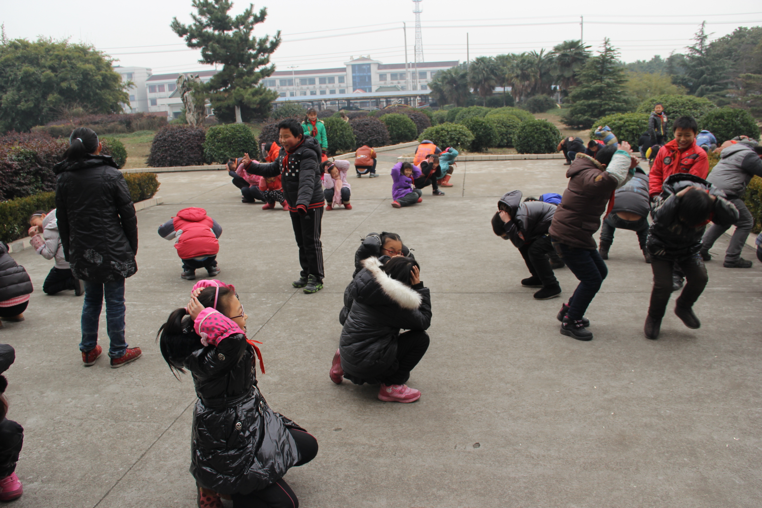 游戏方法:选一人当预报员,其他游戏者面对着他,站成一列横队,相距1米远,游戏开始,当预报员发出各种气象预报时,全体游戏者要作出勇敢的反应,如: “刮大风!”-“不怕!” “下大雨!”-“不怕!” “有大雾!”-“不怕!” “下大雪!”-“不怕!” 唯独听到“下冰雹罗!”必须赶快转身抱头蹲下,要是动作迟缓被预报员发现就算失误,互换角色。接着游戏开始,谁失误三次就要表演一个节目。